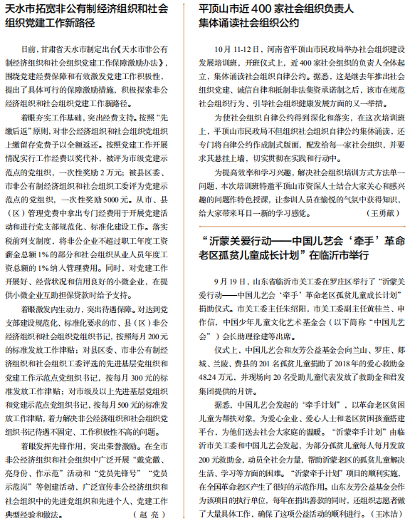 日前,甘肅省天水市制定出臺《天水市非公有制經(jīng)濟組織和社會組織黨建工作保障激勵辦法》,圍繞黨建經(jīng)費保障和有效激發(fā)黨建工作積極性,提出了具體可行的保障激勵措施,積極探索非公經(jīng)濟組織和社會組織黨建工作新路徑。