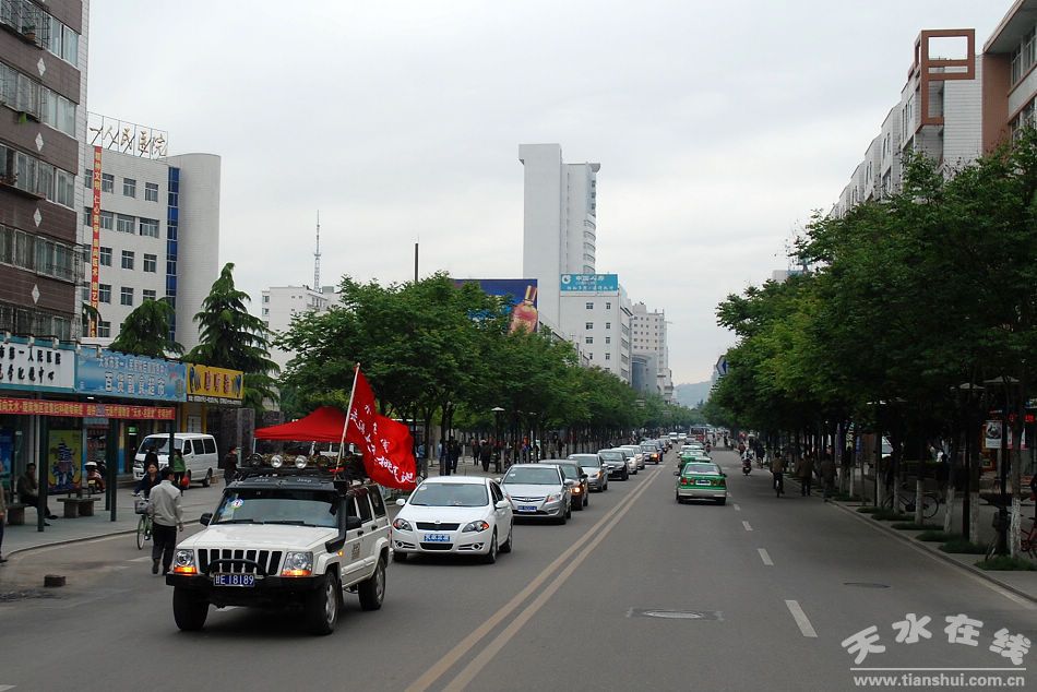 ▲2009年5月24日,天水在線舉行“周日自駕游 品嘗煙鋪大櫻桃”活動。當(dāng)日共有五十多輛車,二百多人參加了本次活動。圖為自駕車隊(duì)經(jīng)過百貨大樓)