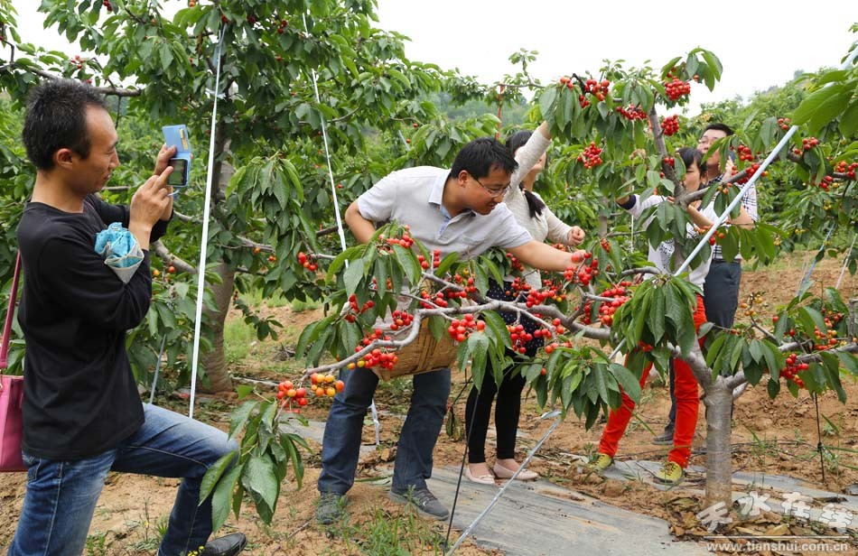 ▲2012年5月20日上午,天水在線策劃舉行秦州區(qū)玉泉鎮(zhèn)煙鋪村大櫻桃采摘儀式。
