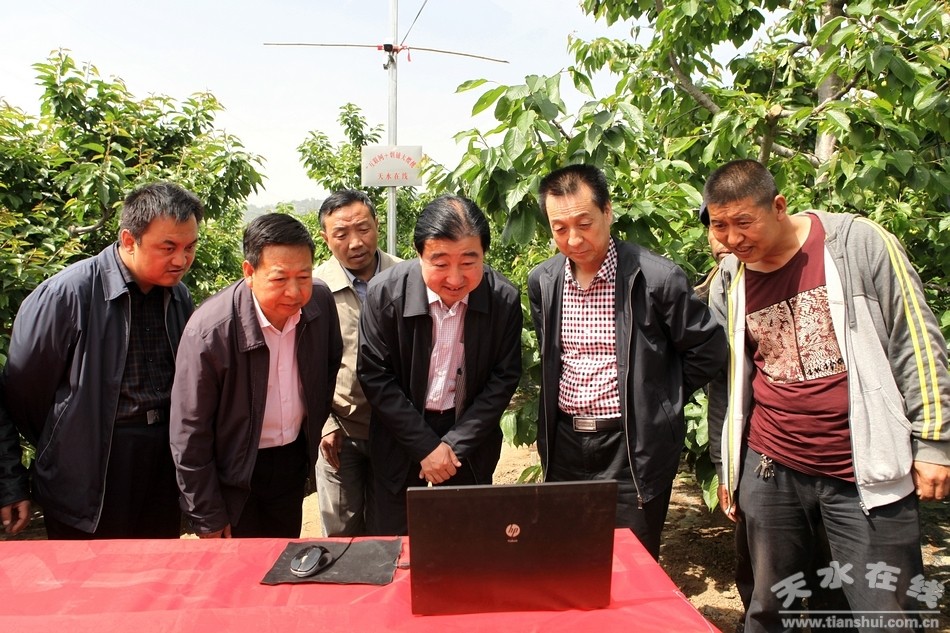 ▲2015年5月15日上午,天水在線“互聯(lián)網(wǎng)+煙鋪大櫻桃行動”啟動儀式在煙鋪櫻桃園舉行,標(biāo)志著由天水在線投資為煙鋪櫻桃園拉的光纖、網(wǎng)絡(luò)攝像頭、WIFI開始正式運(yùn)行。天水市副市長霍衛(wèi)平,市政府副秘書長王小春,市林業(yè)局局長王學(xué)鋒,秦州區(qū)委常委、副區(qū)長李子園,秦州區(qū)林業(yè)局局長張雪亮,秦州區(qū)果業(yè)局局長王喜林等出席啟動儀式。