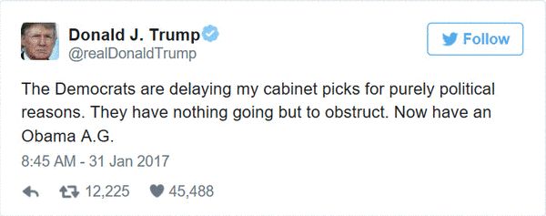 而特朗普則發(fā)布推文表示,這一切都是美國民主黨的陰謀:"民主黨人推遲我的內(nèi)閣甄選,純粹是出于政治意圖。他們就是誠心添亂。你看,現(xiàn)在出馬的是奧巴馬任命的司法部長。"