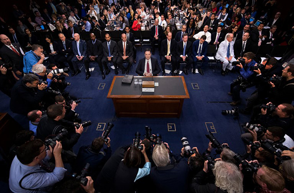 六月八日,被特朗普解職的前聯(lián)邦調(diào)查局(FBI)局長(zhǎng)科米終于來(lái)到國(guó)會(huì)山,在參議院作證,講述他與白宮的過(guò)結(jié)。主流媒體已經(jīng)翹首盼望了好一陣,聽證會(huì)前兩天就開始發(fā)出鋪墊的文章,介紹背景[1]。各大電視網(wǎng)絡(luò)也做好現(xiàn)場(chǎng)直播的準(zhǔn)備。在三大無(wú)線電視網(wǎng)來(lái)說(shuō),實(shí)況傳播要擠掉日常的節(jié)目安排,廣告費(fèi)的損失數(shù)百萬(wàn)美元。如此規(guī)模的陣仗擺在聽證會(huì)上是難得一見,上一次發(fā)生已是十九年前,國(guó)會(huì)調(diào)查克林頓的緋聞,為彈劾做準(zhǔn)備。