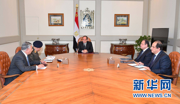 11月24日,在埃及首都開(kāi)羅,埃及總統(tǒng)塞西(中)在襲擊發(fā)生后召開(kāi)全國(guó)反恐委員會(huì)緊急會(huì)議商討對(duì)策。新華社發(fā)