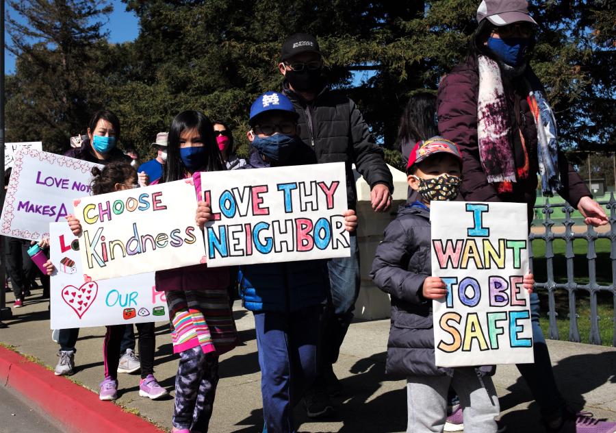2月27日,在美國加利福尼亞州舊金山灣區(qū)圣馬特奧市,人們參加集會反對針對亞裔的歧視行為和仇恨犯罪。新華社記者 吳曉凌 攝