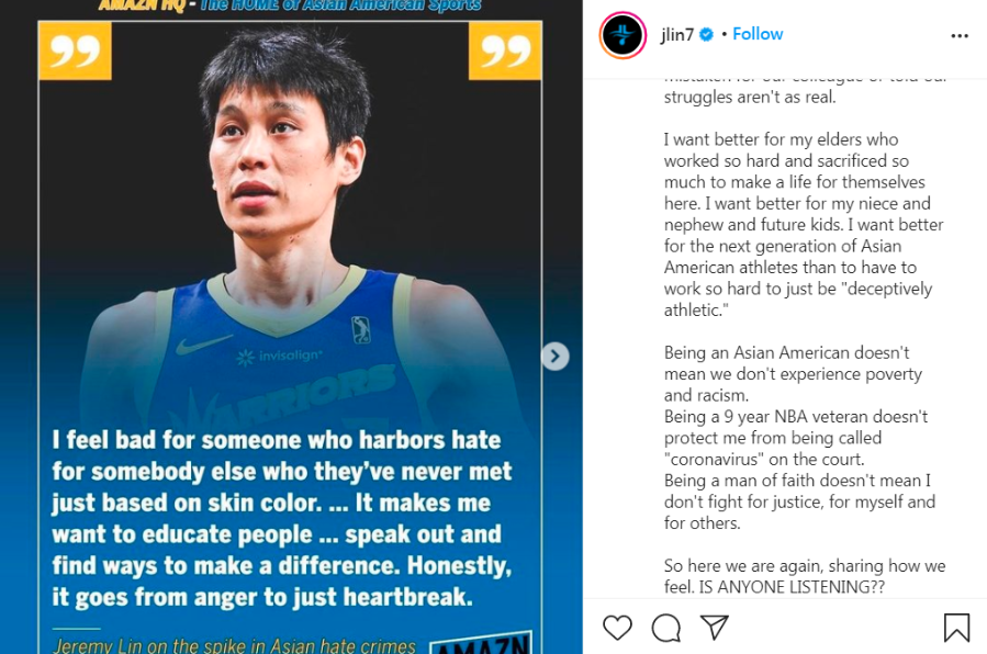 美國華裔籃球明星林書豪在社交媒體上說,“作為打了9年NBA的老將,我還是免不了在球場上被稱為‘新冠病毒’!保▓D為網(wǎng)絡截屏)