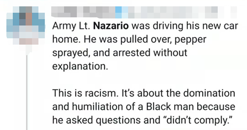 一位為國(guó)效力的美國(guó)黑人軍官,就這樣被白人警察噴胡椒噴霧、毆打,甚至被死亡威脅,多么諷刺!在美國(guó)系統(tǒng)性的種族歧視下,就連保家衛(wèi)國(guó)的黑人軍官,也無(wú)法在白人警察面前獲得尊嚴(yán),可見(jiàn)美國(guó)的種族主義痼疾已經(jīng)嚴(yán)重到了何種地步!從“無(wú)法呼吸”的弗洛伊德到納扎里奧,悲劇屢屢發(fā)生,卻始終無(wú)法避免,悲憤的黑人們,只能像納扎里奧那樣一遍遍心碎地質(zhì)問(wèn):