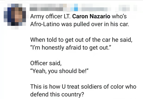 卡倫·納扎里奧是美國(guó)一名非洲和拉丁裔混血的少數(shù)族裔軍官。近日,他起訴弗吉尼亞州溫莎市兩名白人警察涉嫌暴力執(zhí)法和種族歧視。因?yàn)檫@兩名警察在執(zhí)法時(shí),不僅拿槍指著他,噴灑胡椒噴霧,甚至毆打他,給他戴上手銬。