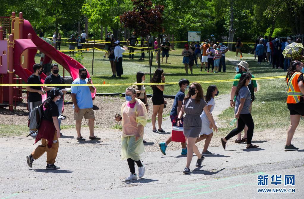 6月12日,人們在加拿大多倫多的一處新冠疫苗臨時接種點外排隊。