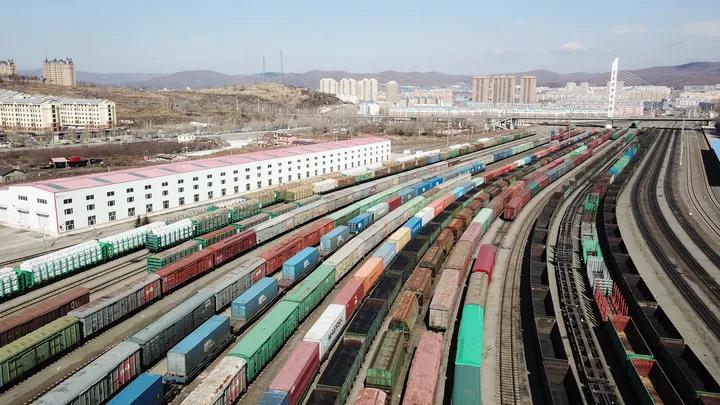 這是3月31日拍攝的綏芬河站南場(chǎng),中歐班列從這里出入境(無人機(jī)照片)。新華社記者王建威攝