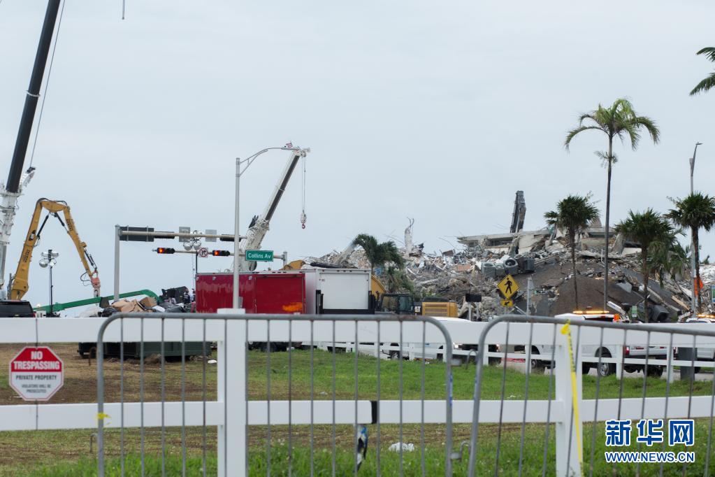這是7月6日拍攝的美國佛羅里達(dá)州邁阿密-戴德縣的住宅樓坍塌事故現(xiàn)場。新華社發(fā)(莫妮卡·麥克蓋文攝)