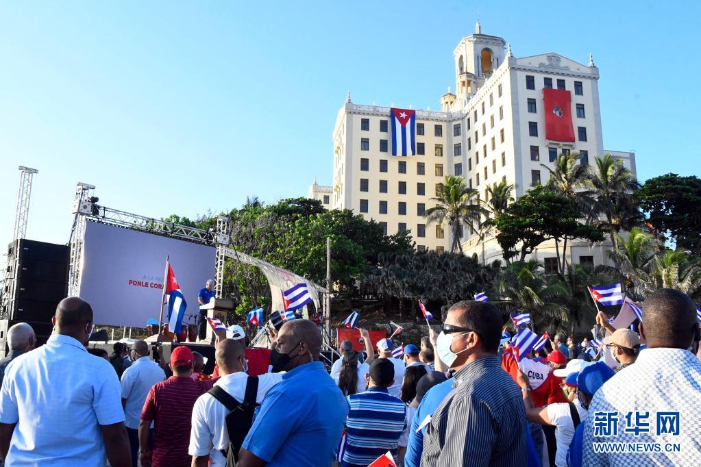 7月17日,民眾在古巴首都哈瓦那參加愛國集會。新華社發(fā)(華金·埃爾南德斯攝)