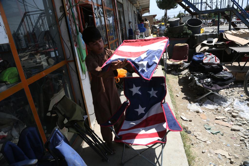 2021年7月3日,在阿富汗帕爾萬省的巴格拉姆空軍基地附近,當(dāng)?shù)鼐用裨诿儡娺z留下的物品中回收廢舊物。新華社發(fā)(拉赫馬圖拉·阿里扎達(dá)攝)