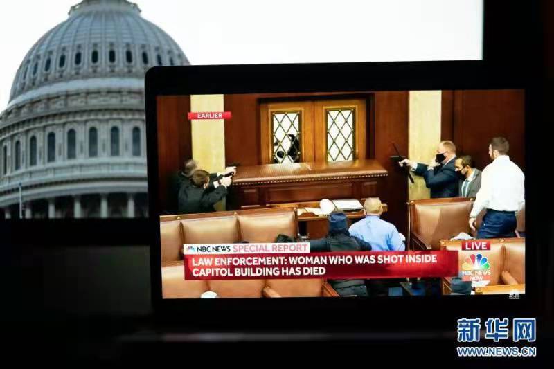 資料圖片:2021年1月6日拍攝的電視畫面顯示,美國華盛頓國會大廈內(nèi)的工作人員應(yīng)對闖入者。新華社記者 劉杰 攝