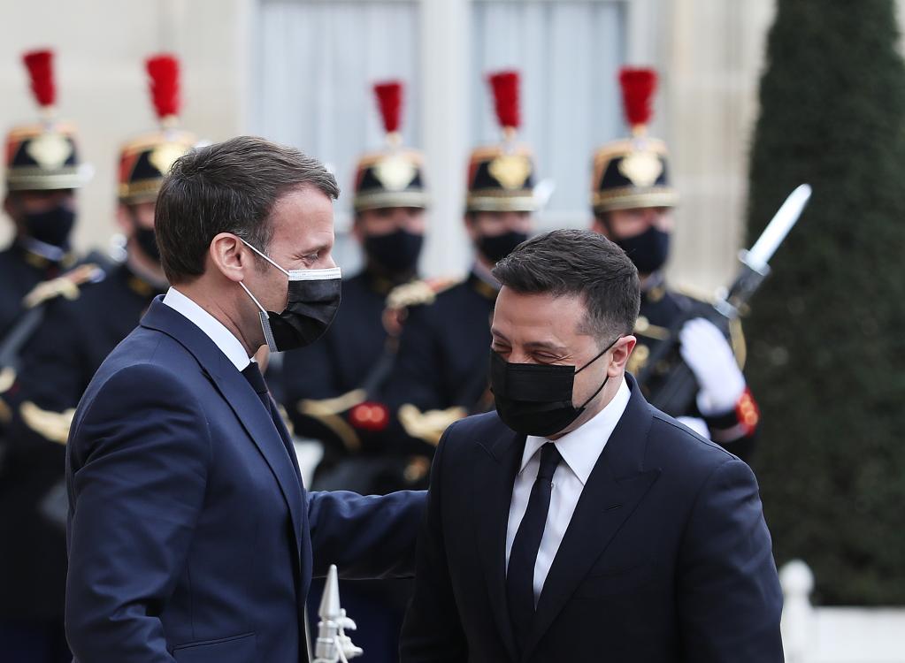 2021年4月16日,在法國(guó)巴黎總統(tǒng)府愛(ài)麗舍宮,法國(guó)總統(tǒng)馬克龍(左)歡迎到訪的烏克蘭總統(tǒng)澤連斯基。(新華社記者高靜攝)