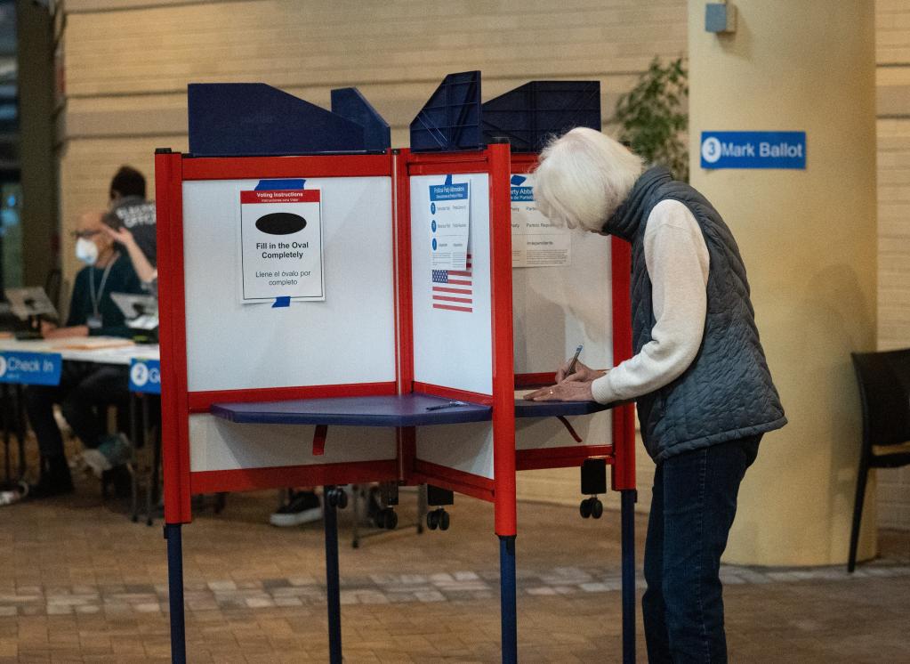 2022年11月8日,美國國會中期選舉在政治極化、社會撕裂、通貨膨脹“高燒不退”以及大多數(shù)人對國家走向不滿的背景下舉行。圖為選民在美國弗吉尼亞州阿靈頓的一處投票點參加中期選舉投票。新華社記者劉杰攝