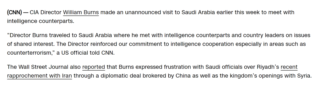 美國媒體報(bào)道,美國中央情報(bào)局局長威廉·伯恩斯日前秘密飛往沙特。伯恩斯此行是對北京斡旋的反應(yīng)動(dòng)作。