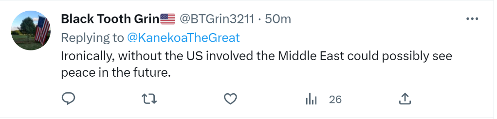 一名自我介紹是美國退役軍人的網(wǎng)友“現(xiàn)身說法”:“真諷刺,沒有美國摻和,中東或許未來就會(huì)實(shí)現(xiàn)和平。”