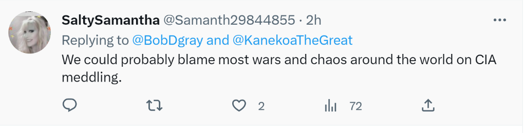 網(wǎng)友“有趣的薩曼莎”說:“世界上絕大多數(shù)的戰(zhàn)爭和混亂都是美國中央情報(bào)局帶來的吧!