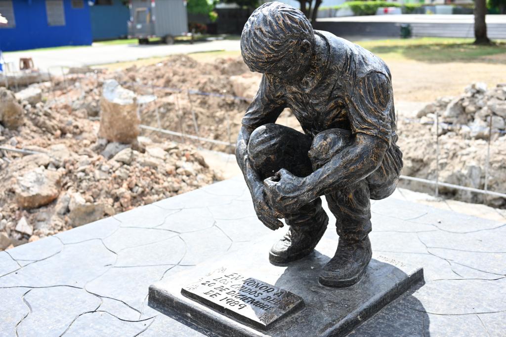 這是2023年12月15日在巴拿馬首都巴拿馬城拍攝的一尊雕像,雕像前的牌子寫著“紀念1989年12月20日的遇難者”。新華社記者陳昊佺攝