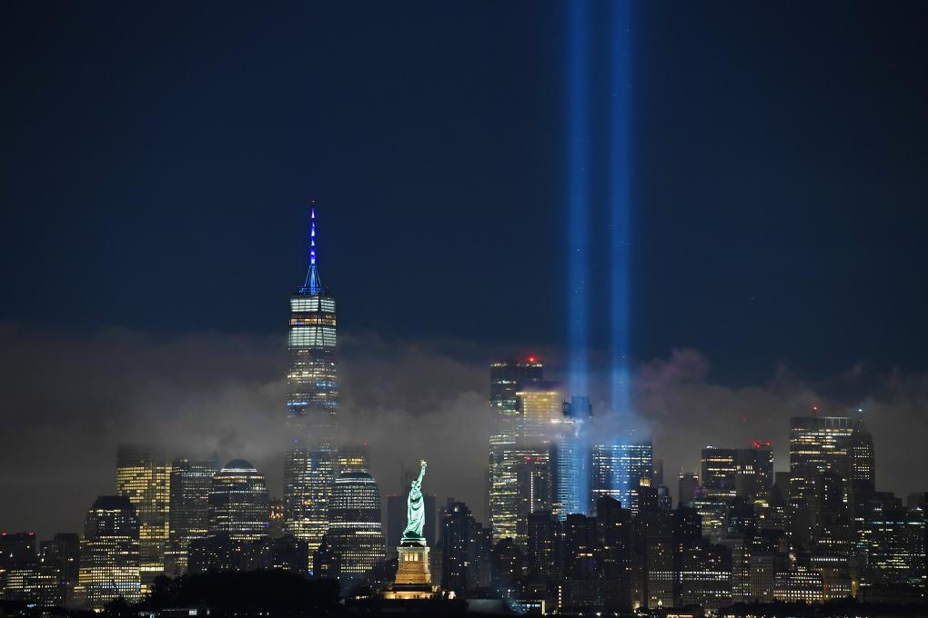2023年9月11日晚,美國紐約世貿(mào)中心遺址附近亮起象征紐約世貿(mào)中心“雙子塔”大廈的光柱,紀(jì)念“9·11”恐怖襲擊事件二十二周年。新華社記者李睿攝