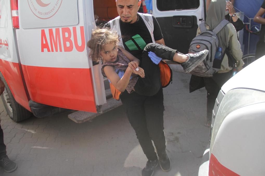 10月21日,在加沙地帶北部謝赫拉德萬(wàn)的醫(yī)院,一名男子抱著受傷的孩子。新華社發(fā)(馬哈茂德·扎基攝)