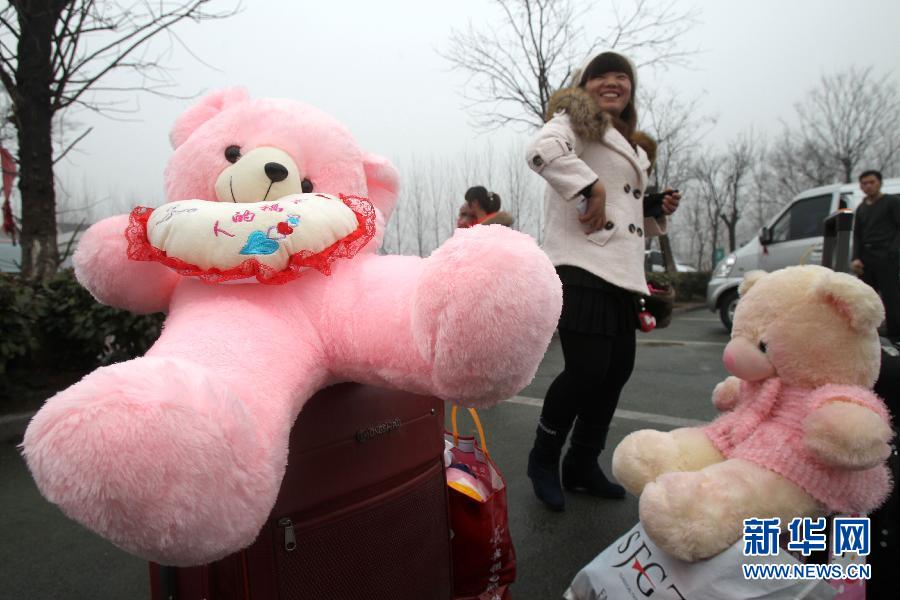 2月1日,江蘇省如皋市一家娛樂用品公司的員工張艷帶著毛絨玩具熊在河南商丘下車。