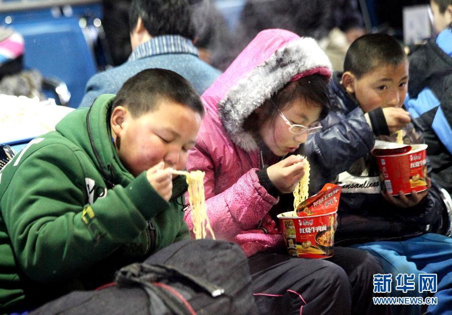 準(zhǔn)備跟父母回家過年的幾個孩子坐在山東省威海市火車站候車大廳吃泡面(2013年1月31日攝)。