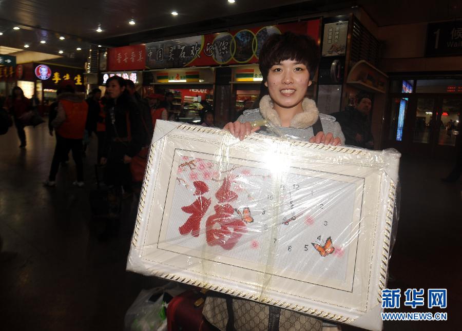 來自河南新鄉(xiāng)的女孩郭靜展示她帶回家的禮物——一幅她親手制作的十字繡。她說:“希望我不在父母身邊的時候,這個禮物能陪伴他們”(1月30日攝)。 1月30日是2013年春運第5天,記者在山西太原火車站采訪帶上行囊回家的人。沉甸甸的行囊,裝滿回鄉(xiāng)人一年的收獲和將與家人分享的喜怒哀樂;行囊或大或小,禮物或重或輕,但都承載著愛、牽掛和夢想。新華社記者 燕雁 攝