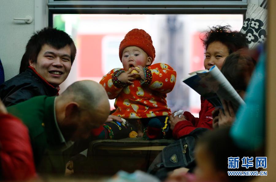 1月26日,一名小朋友在上;疖囌竞蜍噺d內(nèi)等待登車。當(dāng)日,為期40天的春運(yùn)正式啟動(dòng)。春運(yùn)期間,全國(guó)旅客發(fā)送量預(yù)計(jì)將達(dá)到34.07億人次,比2012年春運(yùn)實(shí)際完成增長(zhǎng)8.6%,其中鐵路約2.25億人次,同比增長(zhǎng)4.6%。新華社發(fā) (丁汀 攝)