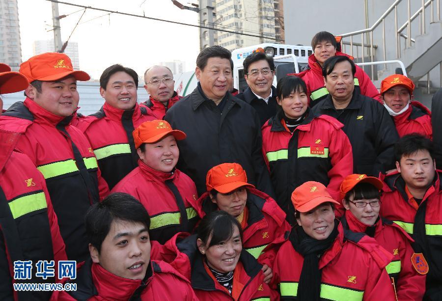 每逢節(jié)慶假日,往往是環(huán)衛(wèi)工人最忙最累的時候。習(xí)近平惦記著這些最普通的勞動者,來到西城區(qū)環(huán)境衛(wèi)生服務(wù)中心手帕口清潔站,向他們祝賀新年。環(huán)衛(wèi)工人們見總書記到來,紛紛向總書記問好?倳浳⑿Φ鼗卮穑骸按蠹液,大家辛苦了”?倳浬钋榈卣f,環(huán)衛(wèi)工人是城市的“美容師”,沒有你們的辛勤勞動,就沒有城市環(huán)境的清潔美麗,就沒有市民生活的安逸舒適。全社會都要尊重環(huán)衛(wèi)工人,廣大市民要珍愛我們生活的環(huán)境,節(jié)約資源,杜絕浪費(fèi),從源頭上減少垃圾,使我們的城市更加清潔,更加美麗、更加文明。