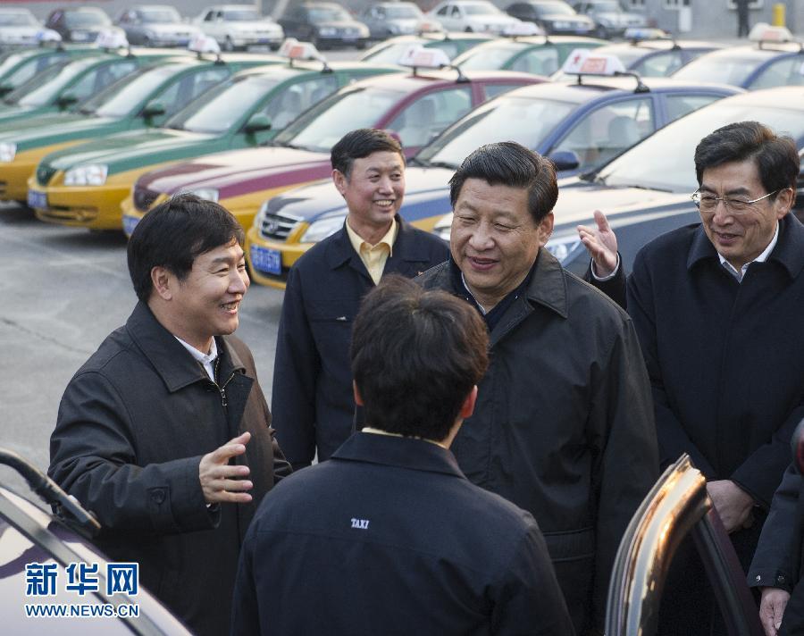 這是習(xí)近平在北京市祥龍出租客運(yùn)有限公司與正在作車輛保養(yǎng)的司機(jī)師傅親切交流并向他們拜年。