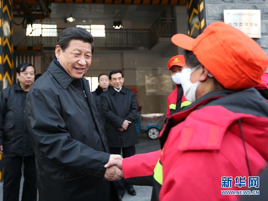 這是習(xí)近平在西城區(qū)環(huán)境衛(wèi)生服務(wù)中心手帕口清潔站看望一線環(huán)衛(wèi)工人。
