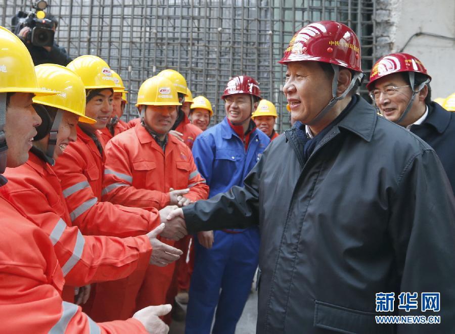 頂著凜冽的寒風(fēng),習(xí)近平在中共中央政治局委員、北京市委書記郭金龍和北京市長王安順陪同下,首先來到地鐵8號線南鑼鼓巷站施工工地,走進(jìn)工人們中間,同大家一一握手問好。他沿著狹窄的工梯下到20多米深的地下作業(yè)平臺,察看工程進(jìn)展情況,向正在施工作業(yè)的農(nóng)民工和工程技術(shù)人員表達(dá)新春的祝福。習(xí)近平對北京市和施工單位的負(fù)責(zé)同志說,發(fā)展公共交通是現(xiàn)代城市發(fā)展的方向。前一段出現(xiàn)的霧霾天氣,對市民工作和生活造成了較大影響。治理霧霾天氣要多管齊下,發(fā)展公共交通、減少汽車尾氣排放就是其中很重要的一個舉措?倳洀(qiáng)調(diào),農(nóng)民工是改革開放以來涌現(xiàn)出的一支新型勞動大軍,是建設(shè)國家的重要力量,全社會一定要關(guān)心農(nóng)民工、關(guān)愛農(nóng)民工。要安排好他們在節(jié)日期間的生活,使他們過上有意義、很愉快的春節(jié)。聽說工地為農(nóng)民工家人團(tuán)聚安排了“夫妻房”,習(xí)近平特地走進(jìn)其中的一間,看望來自河南的鋼筋工范勇一家,關(guān)切地對他們說:“來一趟不容易,看看北京的景點(diǎn),好好團(tuán)聚一下”。
