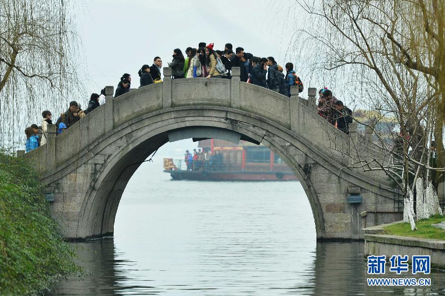 浙江省杭州市西湖邊的一座拱橋上人頭攢動(2月13日攝)。全國假日旅游部際協(xié)調(diào)會議辦公室2月15日晚發(fā)布的春節(jié)假日旅游信息通報顯示,北京、天津、上海、哈爾濱、三亞等39個重點旅游城市黃金周接待游客7600萬人次,同比增長15%。故宮、凈月潭、曲阜三孔、博鰲和玉龍雪山等33個重點景區(qū),春節(jié)期間接待游客同比增長約20%。新華社發(fā) |