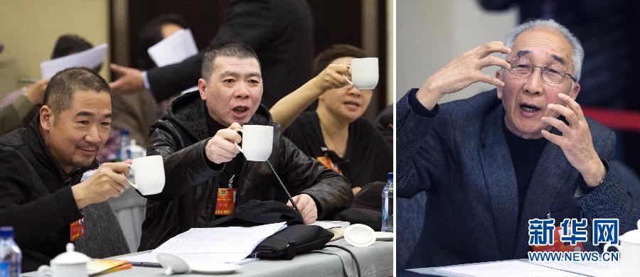 右圖:靳尚誼委員在文化藝術界小組會上說,包括電影和繪畫在內(nèi)的所有藝術,在創(chuàng)作的過程中,藝術家都需要一個自由的創(chuàng)作環(huán)境。左圖:馮小剛委員提議在場的電影人以茶代酒感謝靳尚誼委員對他們的理解與支持(拼版照片,3月6日攝)。新華社記者李學仁攝