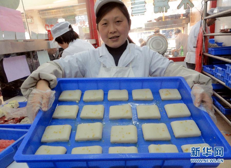 3月13日,蘇州觀前街一家老字號糕點(diǎn)店的營業(yè)員在展示剛出籠的“撐腰糕”。當(dāng)日是農(nóng)歷二月初二,江蘇蘇州民間有吃“撐腰糕”的習(xí)俗,市民們紛紛來到糕點(diǎn)店購買“撐腰糕 ”,期盼一年里平安健康。 新華社發(fā)(王建康攝)