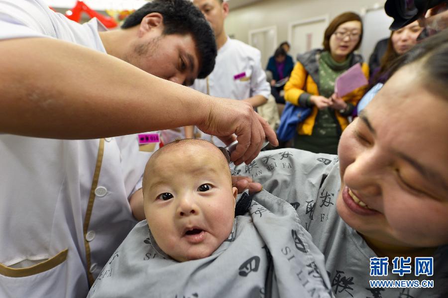3月13日,一位母親懷抱孩子到北京王府井四聯(lián)美發(fā)給孩子剃頭! ‘(dāng)日是農(nóng)歷二月初二,中國民間有“二月二,龍?zhí)ь^”的說法。在這一天,家長帶著孩子到理發(fā)店理發(fā),為新的一年討個好彩頭。小朋友“剃龍頭”時的“五味表情”也成為他們難忘的童年記憶! ⌒氯A社發(fā)(張傳東 攝)