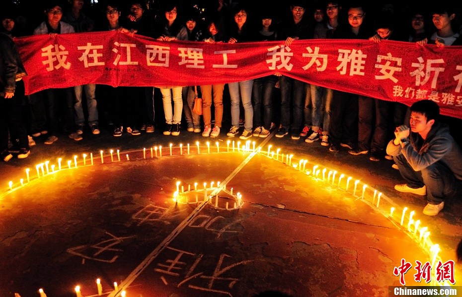 4月21日晚,安徽省合肥市安徽大學磬苑校區(qū)200余名大學生自發(fā)舉行“雅安祈福”活動。大學生們點燃“4.20 雅安”等字樣的蠟燭,在祈福墻上張貼紙鶴和祝福語,為四川雅安地震災區(qū)同胞祈福、加油。 中新社發(fā) 韓蘇原 攝