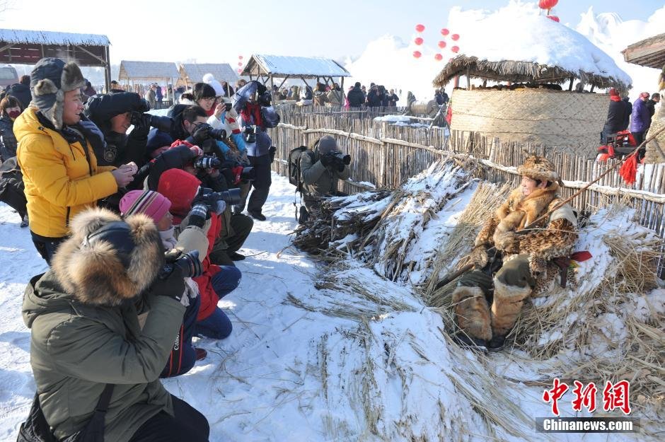 12月22日,第26屆中國哈爾濱·太陽島國際雪雕藝術(shù)博覽會在哈爾濱開幕。圖為游客正在拍攝“鄉(xiāng)村人家”的主人。中新社發(fā) 胡迪 攝