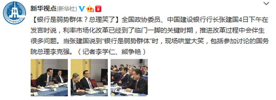 全國政協(xié)委員、中國建設(shè)銀行行長(zhǎng)張建國4日下午在發(fā)言時(shí)說,利率市場(chǎng)化改革已經(jīng)到了臨門一腳的關(guān)鍵時(shí)期,推進(jìn)改革過程中會(huì)伴生很多問題。當(dāng)張建國說到“銀行是弱勢(shì)群體”時(shí),現(xiàn)場(chǎng)哄堂大笑,包括參加討論的國務(wù)院總理李克強(qiáng)。(記者李學(xué)仁、熊爭(zhēng)艷)