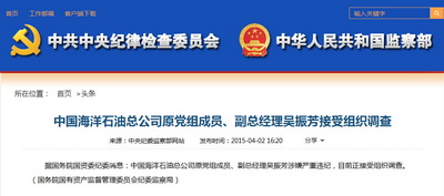 據國務院國資委紀委消息:中國海洋石油總公司原黨組成員、副總經理吳振芳涉嫌嚴重違紀,目前正接受組織調查。(國務院國有資產監(jiān)督管理委員會紀委監(jiān)察局)