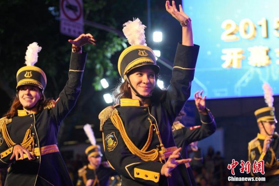 2015年9月12日晚,上海淮海路流光溢彩,第26屆上海旅游節(jié)拉開帷幕。來自19個國家和地區(qū)的23輛花車和31支表演方隊,圍繞著“海上絲路”這一主題,全方位地展示“一帶一路”沿線城市和地區(qū)的風采。圖為美國加州大學洛杉磯分校(UCLA)啦啦隊表演隊亮相。 張亨偉攝