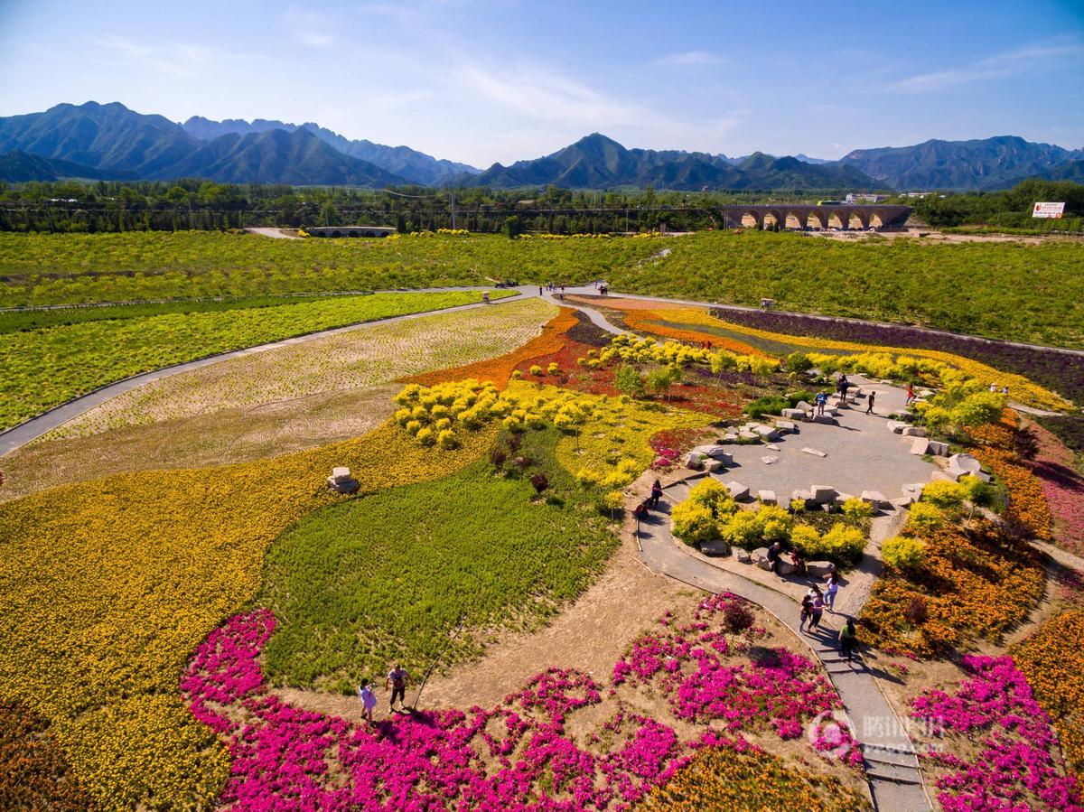2016年5月16日,北京,十三陵水庫旁,大片花海正值花期,吸引了不少市民游客。從空中航拍,畫面壯美。
