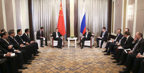 李克強表示,今年是《中俄睦鄰友好合作條約》簽署15周年。中方愿同俄方鞏固政治互信,深化各領(lǐng)域務實合作,密切在國際和地區(qū)事務中溝通協(xié)調(diào),在亞歐會議和上合組織等框架下開展協(xié)作,維護共同利益,促進兩國、亞歐大陸乃至世界的和平與發(fā)展。