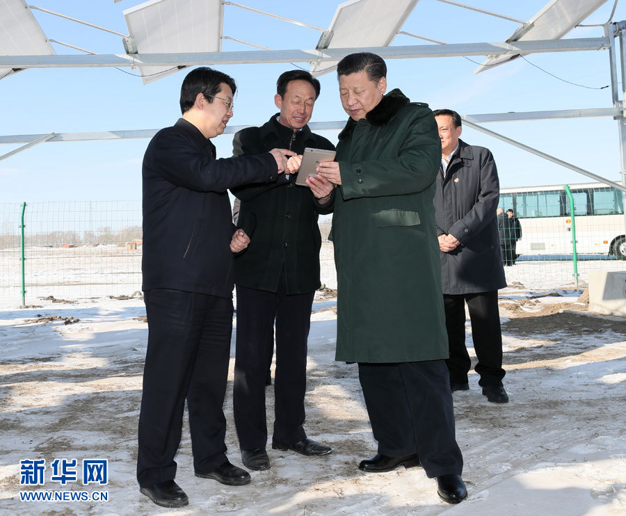 這是習(xí)近平在張北縣小二臺(tái)鎮(zhèn)德勝村了解該村集中式農(nóng)光互補(bǔ)扶貧電站運(yùn)行情況。新華社記者 蘭紅光 攝 |
