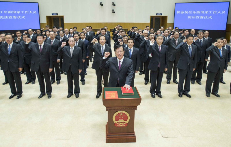 根據(jù)《全國人民代表大會常務委員會關于實行憲法宣誓制度的決定》和《國務院及其各部門任命的國家工作人員憲法宣誓組織辦法》,2016年9月至2017年5月國務院任命的39個部門的62名負責人依法進行憲法宣誓。