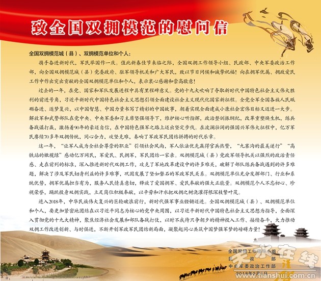慰問信指出,過去的一年,雙擁模范城(縣)黨政軍領(lǐng)導(dǎo)機(jī)關(guān)堅(jiān)持圍繞發(fā)展抓雙擁、抓好雙擁促發(fā)展,在凝聚軍民意志力量、服務(wù)強(qiáng)軍興軍偉業(yè)、助推經(jīng)濟(jì)社會發(fā)展、保障廣大軍民利益等方面,做了大量卓有成效的工作,呈現(xiàn)一地一特色、城城有亮點(diǎn)的生動局面,神州大地處處涌動著軍愛民、民擁軍的熱潮。雙擁模范單位自覺把服務(wù)廣大軍民、推動軍地發(fā)展作為義不容辭的責(zé)任,充分發(fā)揮部門、行業(yè)和系統(tǒng)優(yōu)勢,深入開展雙擁共建活動,創(chuàng)造了許多有特色有影響的新機(jī)制新模式,走在社會前列、成為學(xué)習(xí)榜樣。雙擁模范個人積極支持和參與雙擁,帶著深厚感情擁軍優(yōu)屬,帶著強(qiáng)烈責(zé)任愛民助民,為增進(jìn)魚水情誼付出了辛勞和汗水;厥着f歲,雙擁工作步伐堅(jiān)實(shí)、碩果累累,充分體現(xiàn)了全國雙擁模范的示范引領(lǐng)作用,展示了軍政軍民團(tuán)結(jié)奮進(jìn)的良好精神風(fēng)貌,奏響了“愛我人民愛我軍”的華彩樂章。
