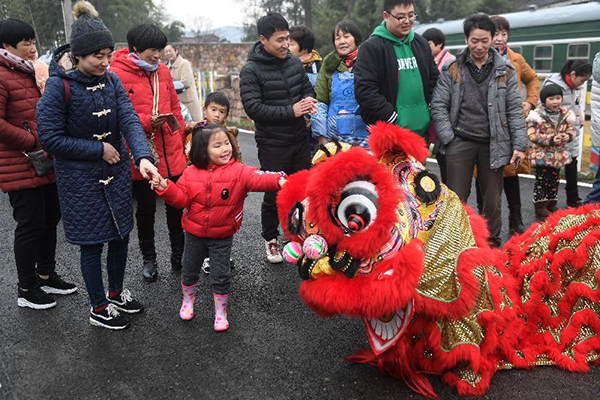 觀看舞獅表演迎新春