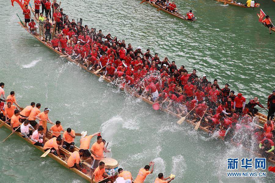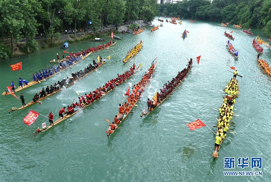 6月5日,人們在貴州省銅仁市碧江區(qū)錦江河上舉行龍舟巡游展演活動。 新華社發(fā)(龍元彬攝)