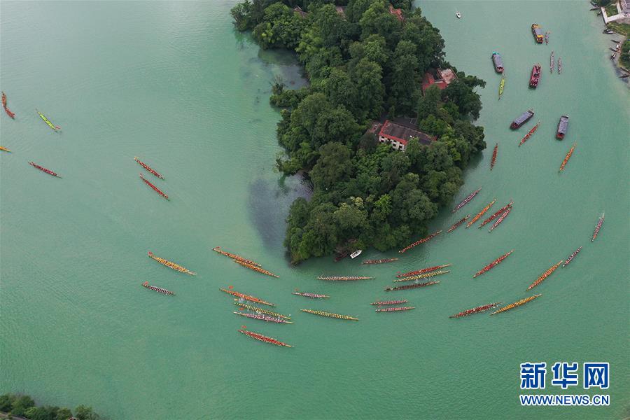 6月5日,人們在貴州省銅仁市碧江區(qū)錦江河上參加龍舟巡游活動(無人機拍攝)。 新華社發(fā)(伍衛(wèi)東攝)